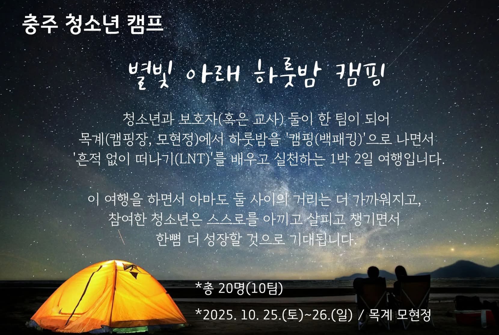 - 10월 25~26일 충주 목계캠프에서 부모와 자녀가 함께 LNT 교육을 받고 텐트를 치고 별빛 아래에서 하룻밤 캠핑을 하였습니다.